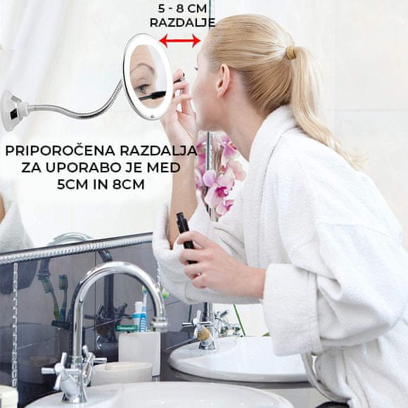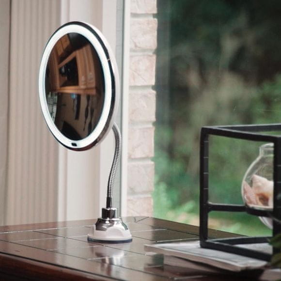 Mojstrsko zasnovano kozmetično ogledalo za ličenje z LED lučkami, ki ima popolnoma prilagodljiv in upogljiv ročaj, da ga lahko uporabljate v vsaki situaciji. Omogoča vam ogled vseh podrobnosti celotnega obraza, da lahko brezhibno nanašate ličila ali obrijete brado.