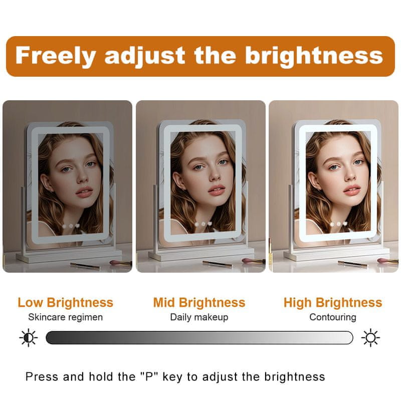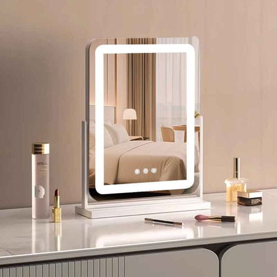 S svojo prikupno pravokotno obliko z zaobljenimi robovi, minimalističnim aluminijastim ohišjem in belim nedrsečim podstavkom, se ogledalo brez težav vklopi v vsako spalnico, kopalnico ali lepotni kotiček. Vgrajena LED osvetlitev s tremi različnimi svetlobnimi toni (3000K / 4000K / 6000K) vam omogoča natančno nastavitev svetlobe glede na priložnost, medtem ko upravljanje na dotik in spominska funkcija zagotavljata hitro in intuitivno uporabo. Kozmetično ogledalo S6P41 je opremljeno z 360-stopinjsko nastavitvijo kota, kar vam omogoča, da ga zavrtite in nastavite točno tako, kot potrebujete.