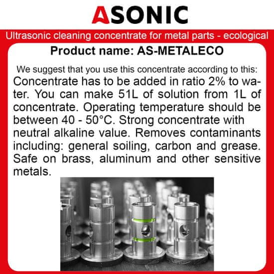 AS-METALECO je okolju prijazen in uporabniku prijazen, površinsko aktivna snov lahko biorazgradljiva (po kriterijih OECD), pH vrednost 9,00 – 9,50;