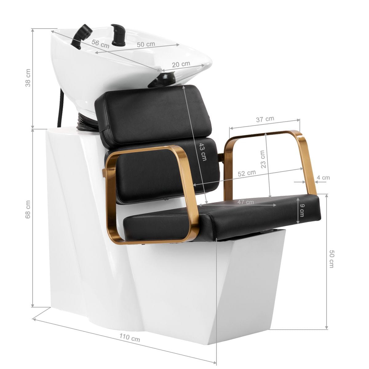 Oblazinjeni stol zagotavlja ustrezno podporo ledvenemu delu in s tem visoko raven udobja. Geometrične zlato obarvane kovinske naslonjale omogočajo pravilno pozicioniranje ramen stranke. Polnilo iz trpežne, deformiranju odporne pene in oblazinjenje iz prijetnega na dotik sintetičnega usnja v črnih odtenkih zagotavljajo trajnost pohištva, enostavno čiščenje in udobno uporabo za dolgo časa. Izviren, eleganten dizajn umivalnika daje notranjosti edinstven videz. Komplet vključuje popolno črno opremo, vključno s pipo, tuš glavo in namenske cevi, da zagotovi popoln nabor orodja za delo.
