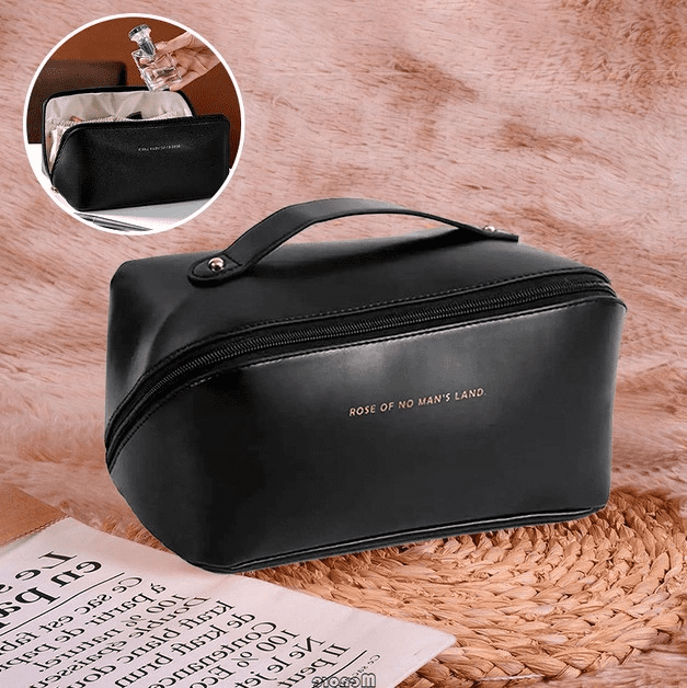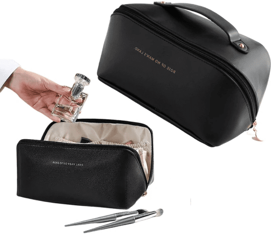 Elegantna kosmetična torbica iz visoko kakovostne črne ekokože združuje prefinjen dizajn z praktičnim razporedom, kar jo naredi idealno izbiro za vsakodnevno uporabo in potovanja. Torbica je podložena z mehkimi materiali, ki ščitijo vaše kozmetične potrebščine in olajšajo vzdrževanje. Organizacijski sistem vključuje veliko predalno z zadrgo, razdeljeno na manjše žepe, ki so popolni za drobnarije, kot so mini kreme ali zobne nitke.