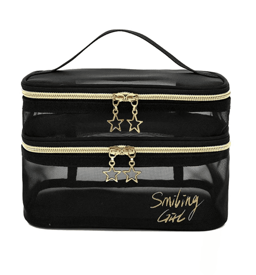 Odkrijte našo veliko kozmetično torbo z organizatorjem, kombinacijo funkcionalnosti, sloga in udobja, ki je idealna za učinkovito shranjevanje kozmetike. Narejena iz odporne najlonske mrežice, torba ponuja dvojnoslojno zasnovo za enostavno organizacijo in hiter dostop do vaših toaletnih potrebščin. Njeni dimenziji (višina 14,5 cm, širina 20,5 cm in širina dna 13 cm) zagotavljajo dovolj prostora, ne da bi izgubili na kompaktnosti, kar jo naredi odličnega sopotnika na potovanjih.