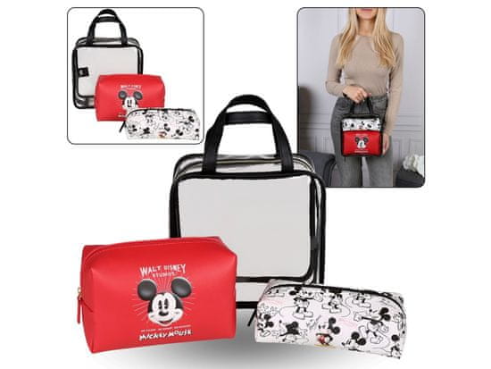Eleganten rdeče-beli komplet potovalnih toaletnih torbic z motivom Mickey Mouse od Disney, sestavljen iz treh kosov različnih velikosti.