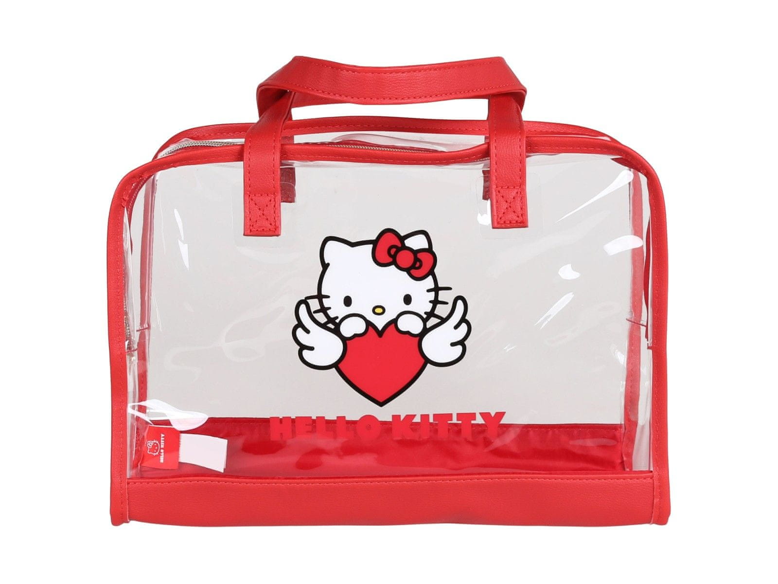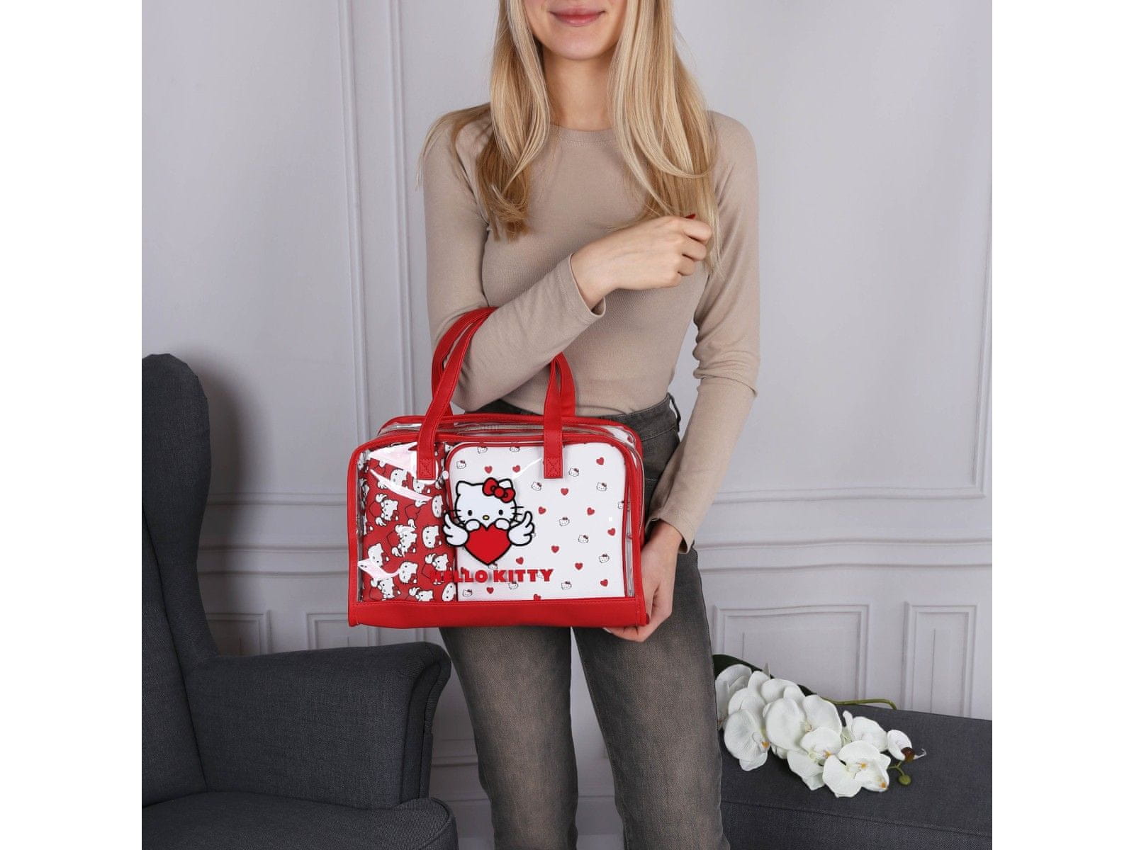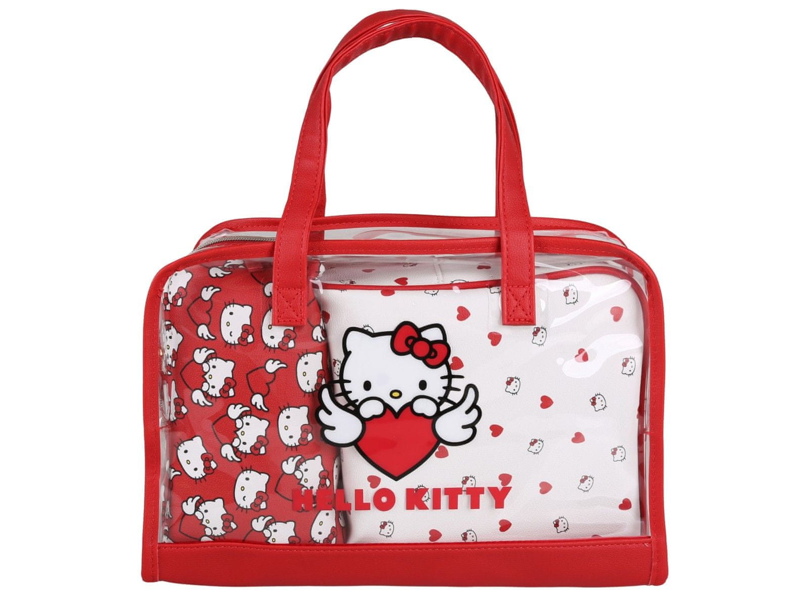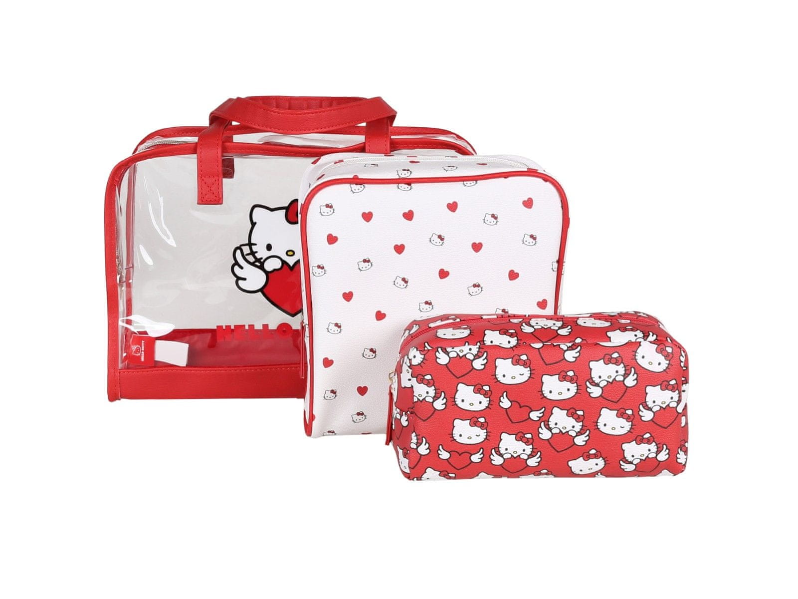 Komplet vključuje prozorno torbico z ročaji in aplikacijo Hello Kitty, srednjo torbico za ličila v beli barvi z rdečimi srčki in majhno torbico za ličila v rdeči barvi z motivom lika Hello Kitty.