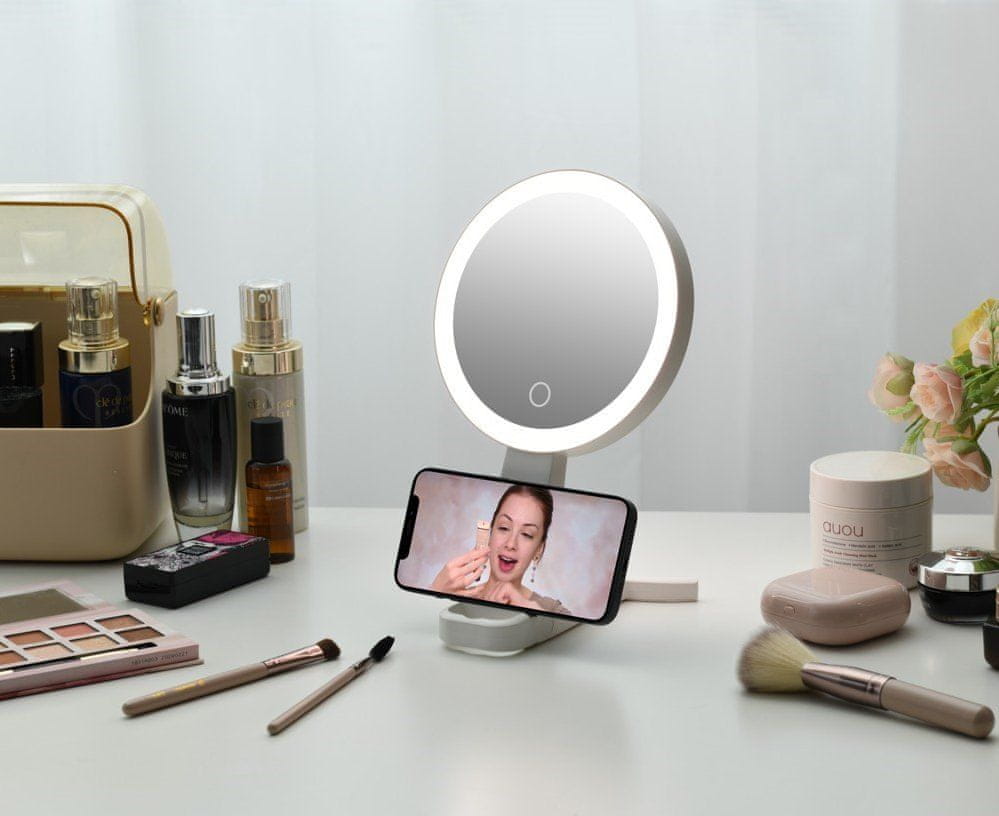 Kompaktno kozmetično ogledalo s prilagodljivim stojalom, resnično osvetlitvijo in akumulatorsko baterijo je popolno za vsakodnevno ličenje.
