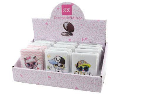 Kvadratno ogledalo z motivom veselih živali. Dimenzije 6×8,5×1,5 cm. Zrcalo je obojestransko, ko je odprto. Pakirano v vrečki. Več vrst – dobavljamo glede na razpoložljivost na zalogi. Izdelek ni igrača.