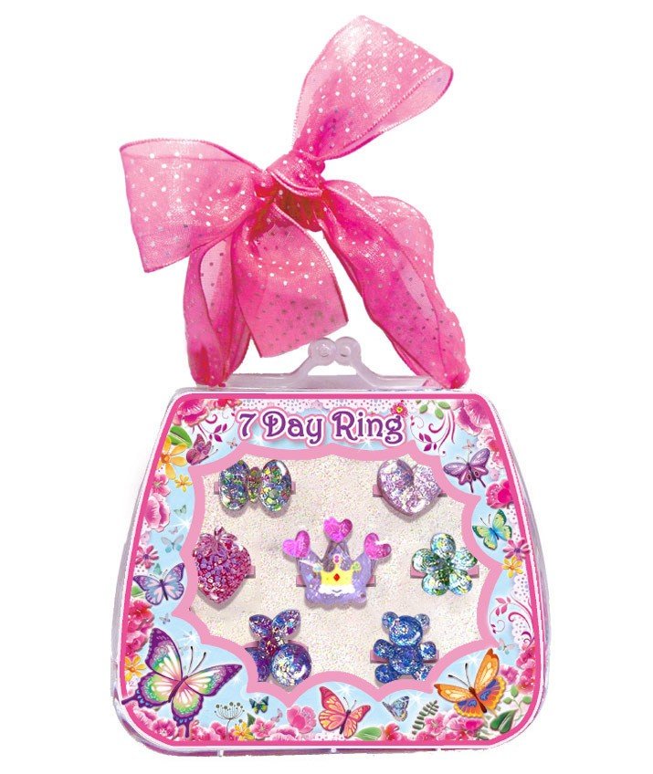 Čudovit komplet sedmih prstanov za vsak dan. Vsaka princeska in deklica bo cenila pisane in bleščeče prstane, ki jih je mogoče vrteti ali deliti s prijatelji. Komplet je priložen v lepi darilni škatli. Primeren za otroke od 6. leta starosti dalje.
