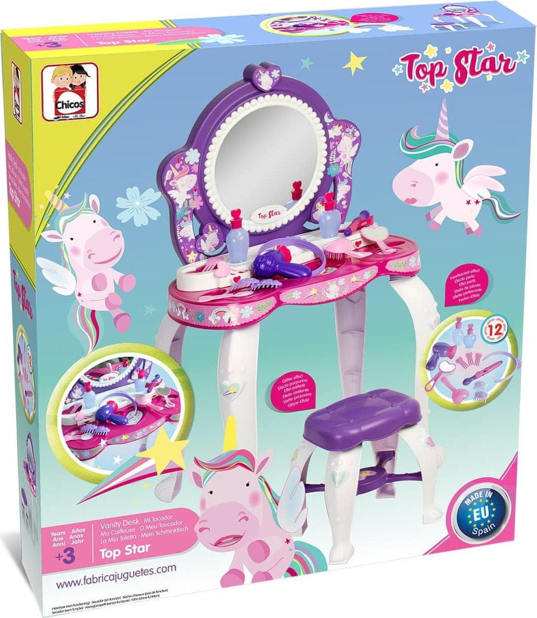 Toaletna mizica, okrašena s slikami samorogov, je eleganten dodatek za vse princeske, modele, frizerje in vse male manekenke. Komplet vsebuje: