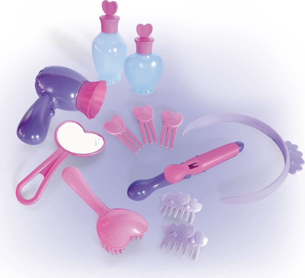 toaletna mizica, stolček, 12 pripomočkov (stekleničke, sušilec za lase, naglavni trak, sponke itd.)