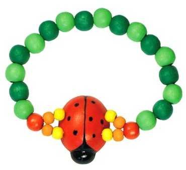 Detski nakit iz lesenih kroglic, nanizanih na gumico. Zapestnica je dolga približno 70 mm. Ni primerna za otroke, mlajše od 3 let. Vsebuje majhne dele. Izdelek ni zdravju škodljiv.
