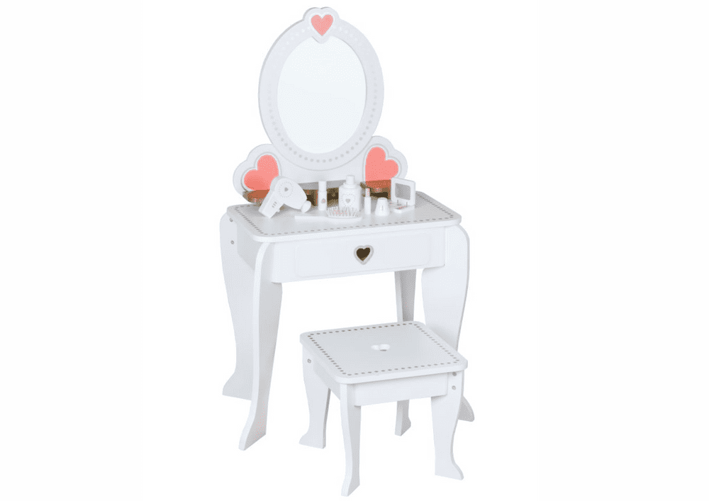 Poleg tega je zraven toaletne mizice čudovit stol. Celota je okrašena z vzorci srčkov in zlatimi elementi, ki bo popolna dopolnitev otroške sobe.