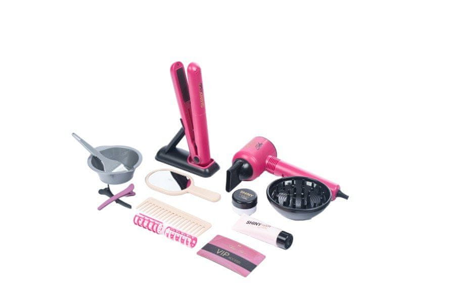 Velik komplet za friziranje vsebuje 16 kosov. Sušilnik za lase deluje na baterije. Glavnik, škarje, ravnalnik za lase, komplet za barvanje las.