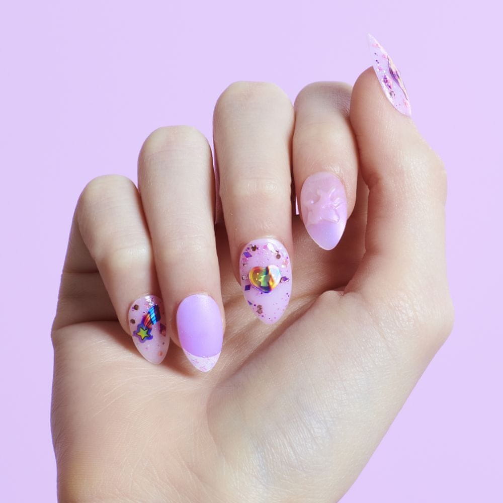 Eksluzivni paket dveh domiselno zapakiranih kompletov manikure z edinstvenimi slogi, kot so svetleči nohti v temi, dišeči nohti, nohti, ki spreminjajo barvo, in še več. 80 lepljivih nohtov (2 posebna učinka), 4 3D nohti (2 posebna učinka), 10 lepljivih nohtov (2 posebni presenečenji), 2 lista nalepk presenečenja + 2 bleščeči foliji, 4 lističi lepila za nohte, 2 posebna bleščeča laka, 1 pilica za nohte.