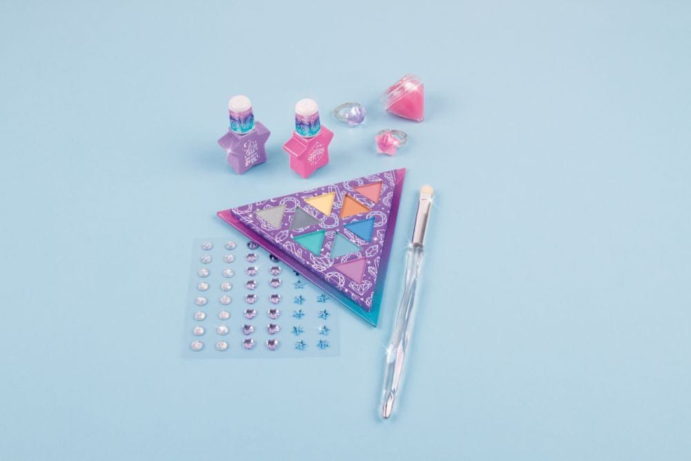 Paleta svetlečih senčil. Aplikacije z bleščicami, ki jih lahko uporabite, da bi bili elegantni. Komplet vsebuje 1 paleto senčil za oči, 1 kozmetični čopič, 1 list okrasnih kristalov za obraz, 1 bleščilo za ustnice, 2 obročka in 2 laka za nohte. Pakirano v škatli. Primerno za otroke, stare 8 let in več. Laki za nohte so na vodni osnovi in jih lahko odstranite z nežnim drgnjenjem s toplo vodo in milom.