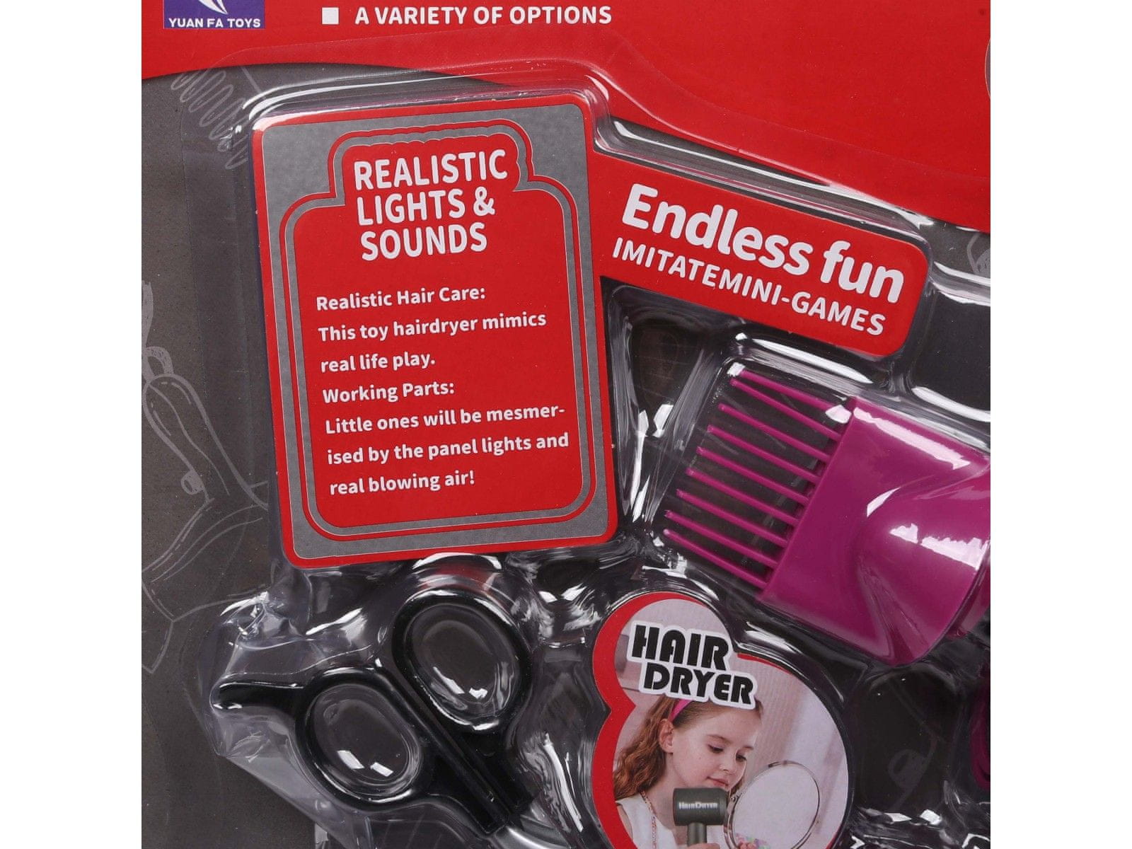 Komplet vključuje sušilnik za lase z realističnimi zvoki, glavnik, škarje, ravnalnik in druge pripomočke, s katerimi lahko igrate vlogo profesionalnega frizerja.
