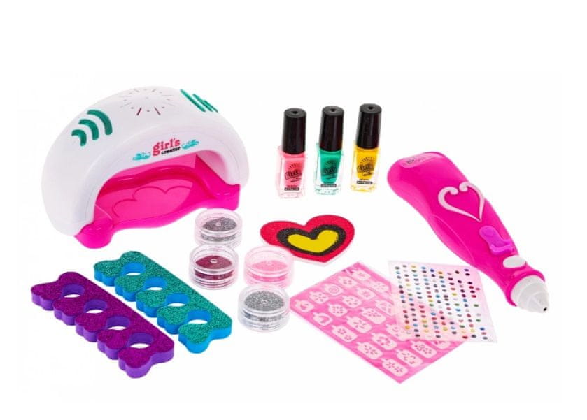 Varen komplet z zvočnimi in svetlobnimi efekti za male manikerke od petega leta naprej. Set vsebuje vse potrebno za izvedbo manikure. Sušilec za nohte res suši nohte in oddaja zvoke sušenja, njegov zgornji del pa je osvetljen z lučkami, napajanje – 2 x AAA 1,5 V (ni priloženo). Na nohte lahko nabrizgamo bleščice s strojčkom za bleščice, napajalnik – 2 x AAA 1,5 V (ni priložen). Lak za nohte je varen in netoksičen ter ga je po igri zelo enostavno odstraniti.
