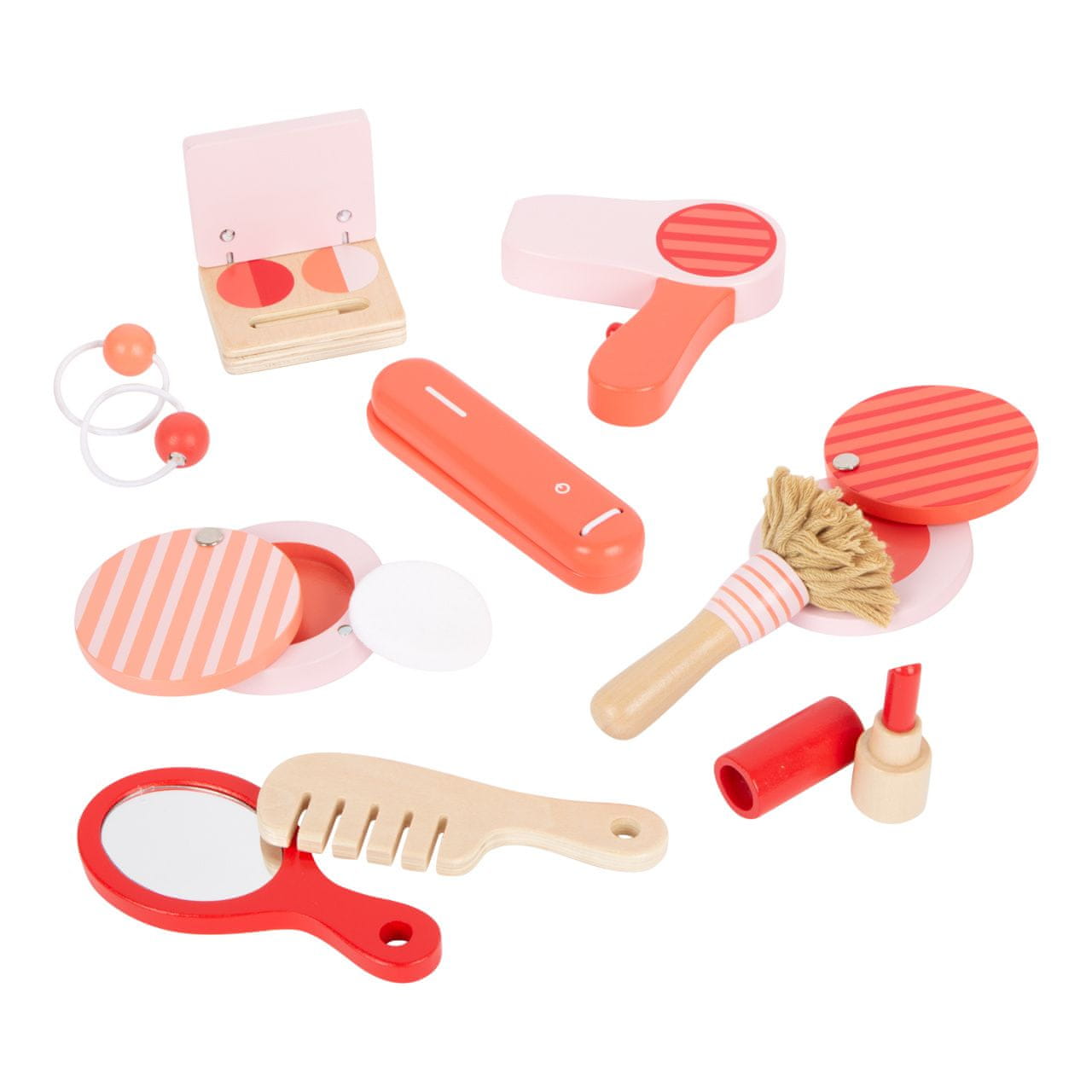 Umetniki ličenja, to je za vas! Kozmetični kovček iz lesa je kot nalašč za igranje vlog. Obsežen komplet sestavljajo glavnik, ogledalo, sušilnik za lase, šminka, puder, senčila za oči, ravnalnik za lase in gumice. Končno se lahko naličite kot mamica! Kovček ima ključavnico, vsi pripomočki pa se vanj priročno pospravijo. Kdo si bo prvi uredil lase? Glavne značilnosti.