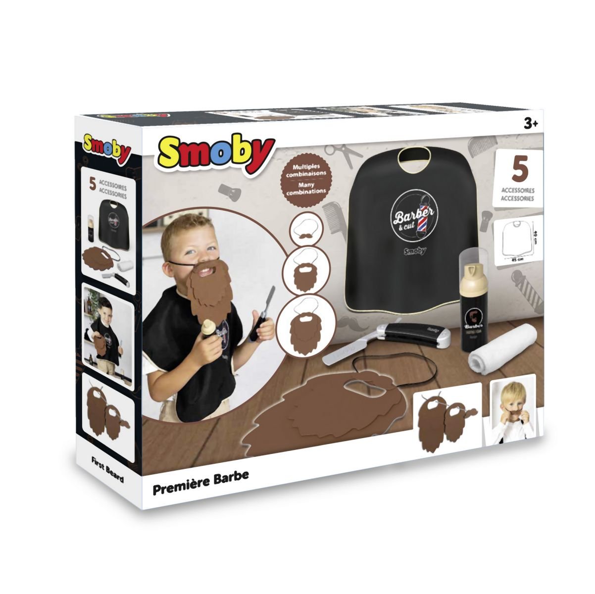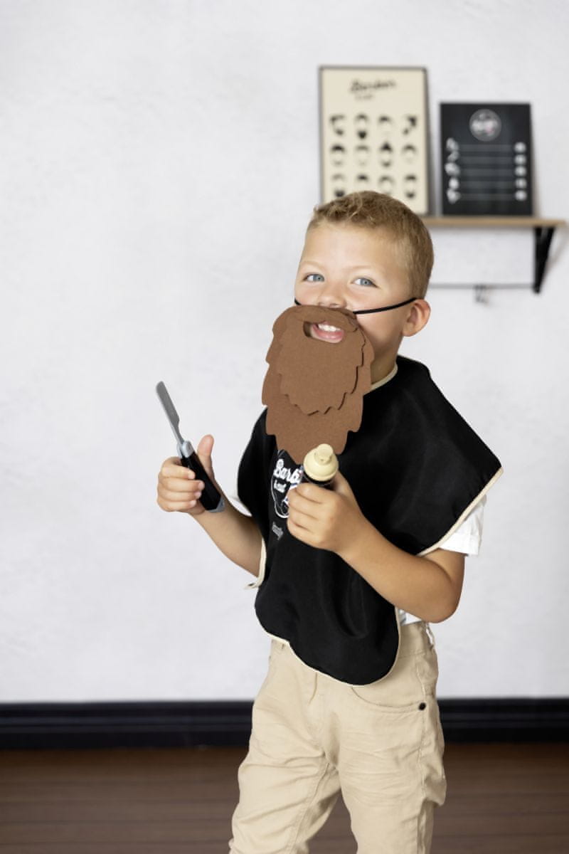 Set za britje, ki ga sestavlja 5 realističnih dodatkov: brada, plašč iz blaga, brivnik, steklenička s peno za britje in brisača. Brada ima več plasti filca, opremljenih s sistemom velcro, ki omogoča ustvarjanje številnih kombinacij z različnimi oblikami in dolžinami ustih in brad. Zabaven komplet, ki vam omogoča, da poskrbite za majhne in velike brade. Starost od 3 let dalje.