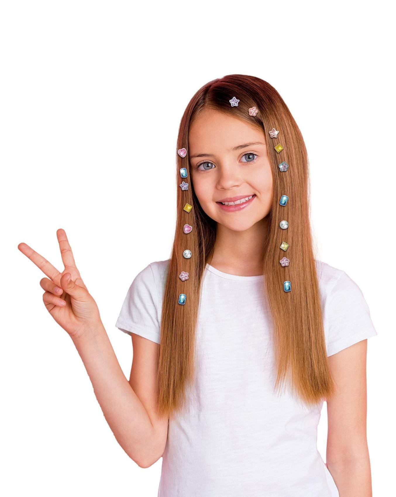 Kreativen komplet 24 diamantov in 24 sponk z aplikatorjem. Diamant vstavite v zgornji del aplikatorja. Sponko vstavite v spodnji del. V sponko na spodnjem delu vstavite šibek pramen las in ga namestite na mesto, kjer želite pritrditi diamant. Stisnite aplikator, da pritrdite diamant na lase z zaponko. Dragi kamen bo ostal pritrjen na pramen las. Dimenzije paketa 22 × 12 × 6 cm Primerno za otroke, stare 5 let in več
