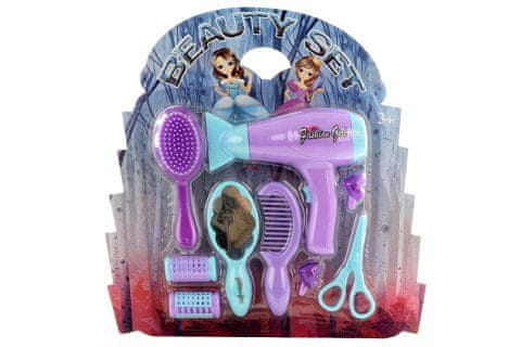 Komplet z baterijskim sušilnikom za lase in dodatki vključuje sušilnik za lase velikosti približno 16 × 15 cm na baterije – 2 bateriji AA, glavnik, krtačo, 2 navijalca, 2 sponki in škarje.Vse iz plastike.Velikost paketa približno 32 × 38 cm. Celoten opis