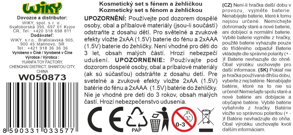 Komplet za lepoto s sušilnikom za lase in likalnikom – popoln pripomoček za male stilistke in manekenke. Komplet vključuje sušilec za lase, likalnik, krtačo, glavnik, 2× škarje, 2× sponke, sprej in nastavke. Sušilnik deluje na 2× AA baterije (niso vključene), likalnik pa na 2× AAA baterije (niso vključene). Dimenzije paketa: 46,5 × 7 × 33 cm. Starost: 3+