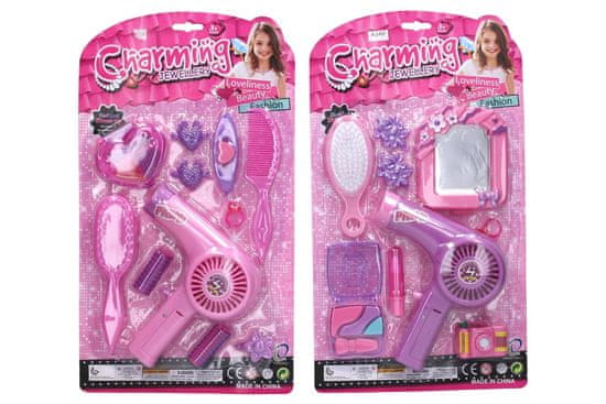 Kosmetični set. Dimenzije sušilnika za lase 14×15×5 cm. 1×AA baterija za sušilnik za lase. 2 različici – ogledalo, navijalke.