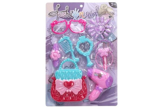 Kosmetični komplet. Vključuje očala, nohte, glavnik, ogledalo, zapestnice, torbico, sušilnik za lase in še več.