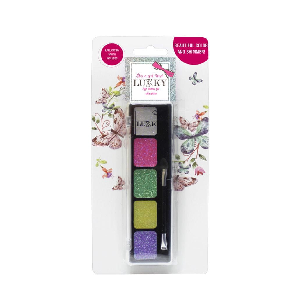 Lukky gel senčilo za oči z bleščicami in čopičem v 5 različnih odtenkih. Primerno za otroke od 3. leta starosti.