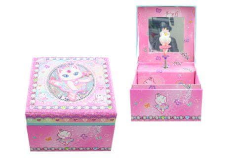 Playing box nakitna skrinja. V notranjosti skrinjice za nakit sta ogledalo in mačka, ki pleše in igra, ko obrnete ključ. Velikost približno 11 × 11 × 8 cm. Pakirano v plastični vrečki. Izdelek ni igrača.