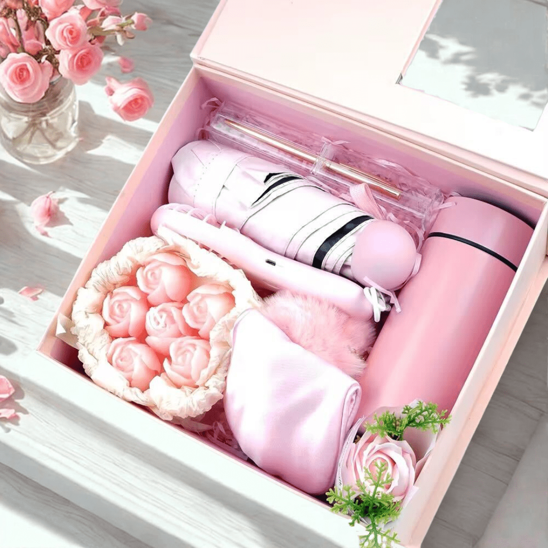 Bodybite Darilni komplet za ženske, darilna škatla, nalivno pero, dežnik, ventilator, sveča | WOMGIFTPINK