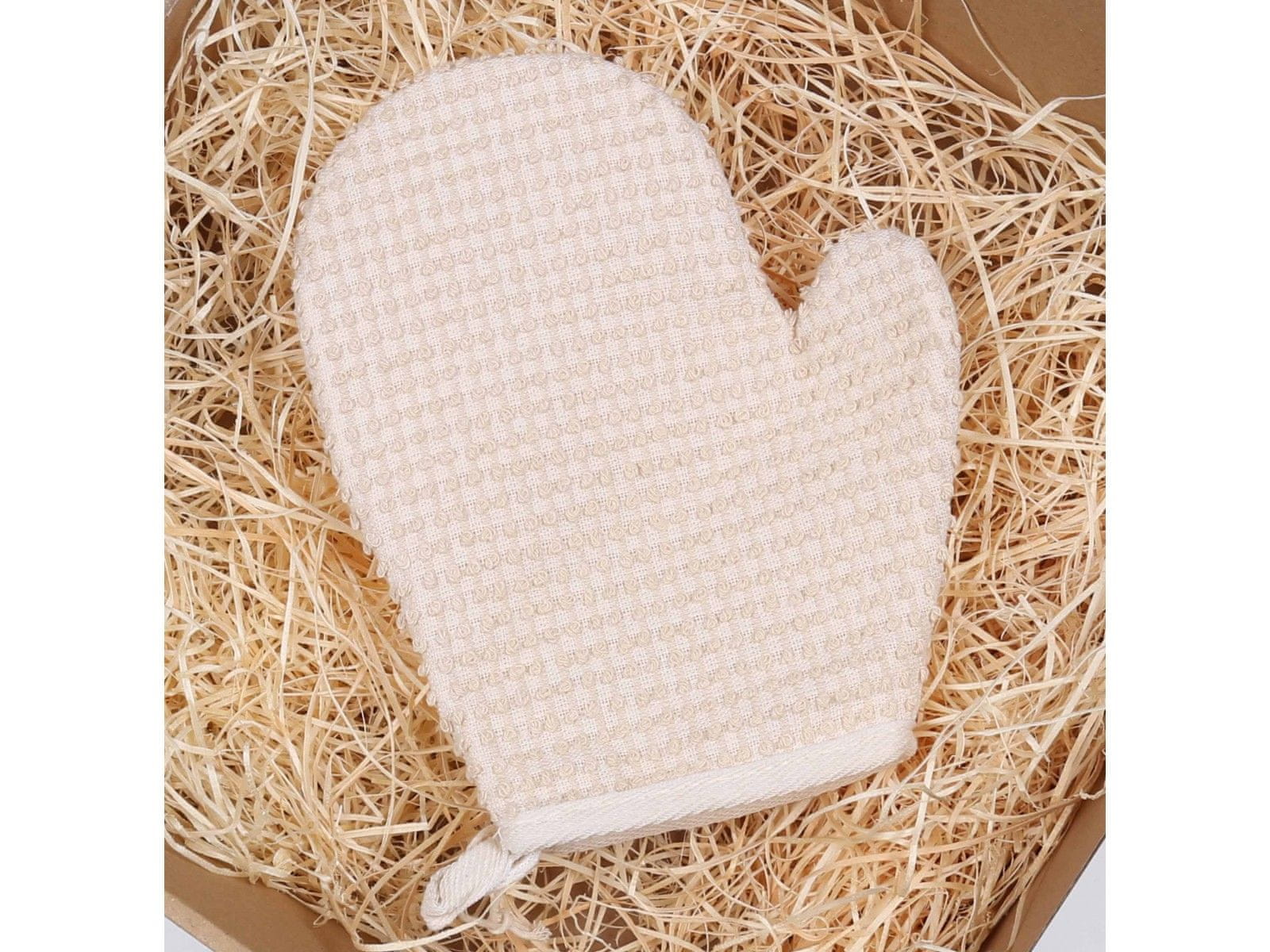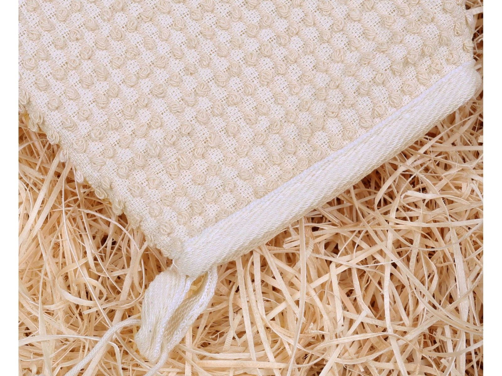 Večnamenska masažna rokavica za kopanje, masažo in piling, izdelana iz naravne bombažne tkanine. Zaščitena je z trdim robom ob strani, na katerem je majhen ročaj za obešanje na obešalnik. Masažna rokavica nežno odstranjuje odmrli kožni sloj, če se uporablja redno – lahko pomaga izboljšati videz kože Celoten opis