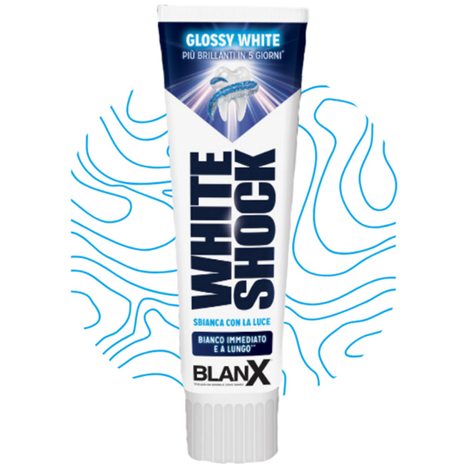 BLANX White Shock je napredna zobna pasta , ki ne le učinkovito čisti zobe, temveč jih tudi varno beli, ne da bi pri tem poškodovala sklenino. Formula paste temelji na inovativni tehnologiji ActiluX® , ki se aktivira ob izpostavljenosti svetlobi in podpira naravni proces beljenja zob. Ta izdelek je zasnovan za vsakodnevno nego in je primeren za ljudi z občutljivimi zobmi, saj zagotavlja dolgotrajno bolj bele zobe in zaščito pred zobno gnilobo.