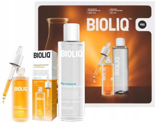 BIOLIQ Pro kozmetični set. Set vsebuje: Intenzivno revitalizirajoči serum 30 ml. Micelarno vodo za vse tipe kože 200 ml. Serum intenzivno revitalizira kožo. Učinkovito vlaži in neguje. Zagotavlja lastnosti proti gubam. Zagotavlja sijaj in lesk. Delovanje: Intenzivno spodbuja revitalizacijo kože. Serum zagotavlja večplastno revitalizacijo kože: aktivno regenerira, vlaži in hrani kožo, vidno gladi gube in jo učvrsti. Obnavlja sijaj in lesk kože ter izboljšuje njen videz in stanje dan za dnem. Koncentrirana formula z izvlečkom kaviarja. Izvleček kaviarja (Acipenser spp.), bogat vir beljakovin, lipidov, vitaminov in mineralov, učinkovito vlaži in neguje kožo. Zaradi visoke vsebnosti antioksidantov ima antioksidativne in fotozaščitne lastnosti, ki podpirajo odpornost kože na zunanje dejavnike. Gladi in učvrsti kožo ter zmanjšuje gube. Serum vsebuje peptidne matrikine, ki aktivirajo mehanizme obnove kože, baikalein pa izboljša njeno čvrstost in elastičnost. Serum ima lastnosti proti gubam in učinkovito zmanjšuje tudi najbolj vidne gube. Dan za dnem obnavlja sijaj in lesk. Serum tudi izenači ten kože in ima posvetlitveni učinek, ki dan za dnem zagotavlja sijaj in lesk puste, utrujene kože. Serum kožo naredi bolj navlaženo, nahranjeno, čvrsto in opazno bolj gladko. Vzljubili ga boste zaradi prijetnega, nežnega vonja, lahke, nemastne konsistence, se hitro vpije, lahko se uporablja pod ličili in se nanaša kapljice za kapljicami. Indikacije: Zasnovan za vsakodnevno nego kože obraza in dekolteja. Navodila za uporabo: Nanesite s pipeto na konico prsta. Nežno vmasirajte v očiščeno kožo obraza, vratu in dekolteja. Izogibajte se stiku z očmi. Micelarna voda: Micelarna formula s pomirjujočim d-pantenolom in vlažilno mešanico niacinamida učinkovito čisti kožo, celo odstrani vodoodporna ličila. Učinkovito čisti kožo. Voda nežno, a izjemno učinkovito čisti kožo obraza, oči in ustnic, celo odstrani vodoodporna ličila. Odstranjevanje ličil brez drgnjenja. Formula temelji na micelih, ki ustvarjajo drobne sferične strukture, ki zajamejo nečistoče. To omogoča enostavno čiščenje brez dolgotrajnega drgnjenja. Kožo neguje, vlaži in pomirja. Zagotavlja hidratacijo občutljive kože. Provitamin B5 (dekspantenol) in vlažilne sestavine vežejo vodo v roženi plasti povrhnjice, kar zagotavlja takojšnjo hidratacijo in olajšanje. Nežna do kože. Ne povzroča zategovanja ali zategovanja, ne izsušuje in ne pušča mastnega filma. Kožo pusti čisto, osveženo in pripravljeno na nadaljnjo nego. Vzljubili jo boste zaradi njenega nežnega, prijetnega vonja, lastnosti, ki ne izsušuje, ne zateguje ali učvrsti, ni lepljiva in ne draži oči. Je popoln uvod v nadaljnjo nego. Indikacije: Ta micelarna voda je namenjena čiščenju in odstranjevanju ličil z obraza, oči in ustnic. Primerna je tudi za občutljivo kožo. Navodila za uporabo: Za čiščenje obraza, oči in ustnic uporabite vatno blazinico, namočeno v tekočino. Za optimalno odstranjevanje ličil z oči blazinico položite na veko in počakajte nekaj sekund. Nato nežno odstranite ličila s kože z gibi navzdol. Uporabljajte po potrebi. Izpiranje ni potrebno.