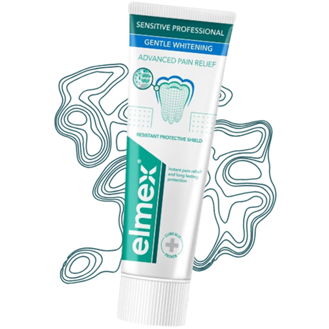 Elmex Sensitive Gentle Whitening je izdelek, priporočljiv za ljudi z občutljivimi zobmi, ki želijo nežno pobeliti zobe. Še posebej primeren za tiste, ki se spopadajo z občutljivostjo po uživanju vročih ali hladnih pijač ter sladke hrane.