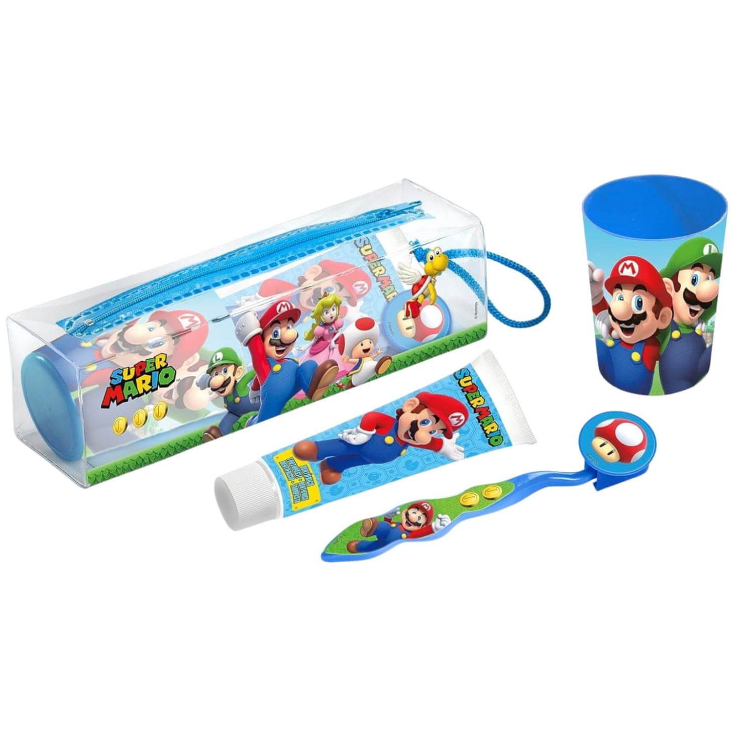 Komplet risanke Super Mario: zobna ščetka, zobna pasta, skodelica Set za otroke z motivom Super Mario Set vsebuje: skodelica, zobna pasta 75ml, zobna ščetka, majhna glava prilagojena otrokovim ustjem, ima nežne ščetine, ki odstranjujejo zobne obloge brez nevarnosti draženja, priložen pokrovček