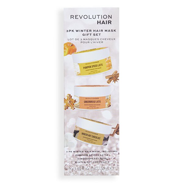 Komplet vključuje: Hydra traction maska za lase Gingerbread Latte ( Moisturising Hair Mask) 50 ml Hranilna maska za lase Winter Hot Chocolate ( Nourish ing Hair Mask) 50 ml Maska za enostavno razčesavanje las Pumpkin Spiced Latte (Conditioning Hair Mask) 50 ml. Celoten opis