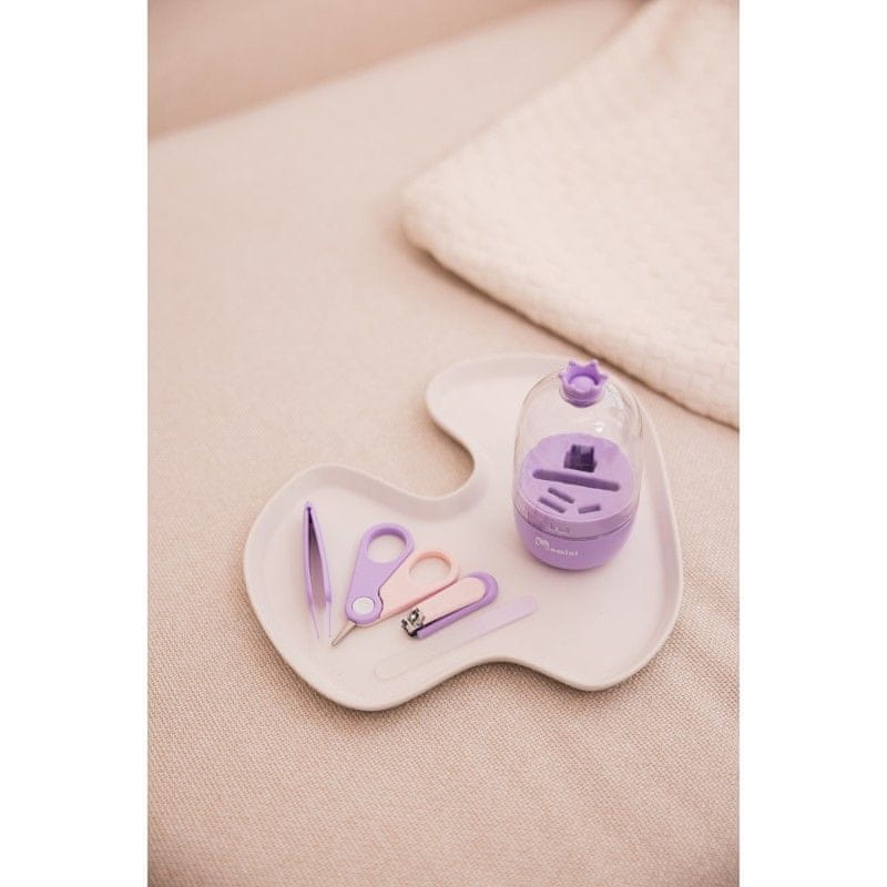 Komplet za nego dojenčka Lilac znamke Momini je odlična izbira za novopečene starše. Set 4v1 vsebuje ščipalko za nohte, škarje, pilico za nohte, pinceto in praktično posodo za shranjevanje. Zagotavlja vse potrebno za vzdrževanje higiene vašega dojenčka. Elementi seta so varni in enostavni za uporabo, kar omogoča nestresno in udobno nego. Vsak kos je bil skrbno zasnovan tako, da se popolnoma prilega malim nohtkom in rokam vašega dojenčka.