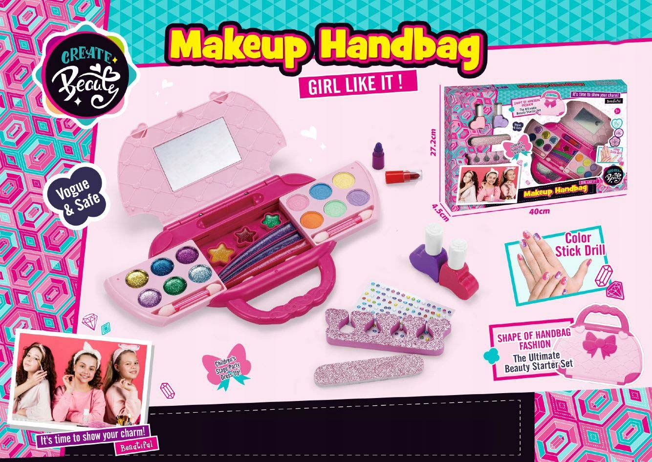 Poslikava obraza, oči ali nohtov – vse to je mogoče s tem kompletom. Kozmetika je shranjena v očarljivi roza vrečki.