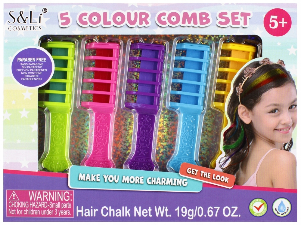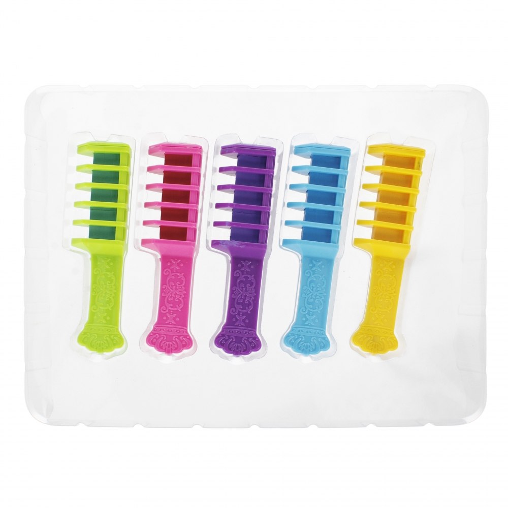 Komplet vsebuje 5 glavnikov za barvanje las, vsak v naslednjih barvah: roza, zelena, vijolična, modra, rumena.