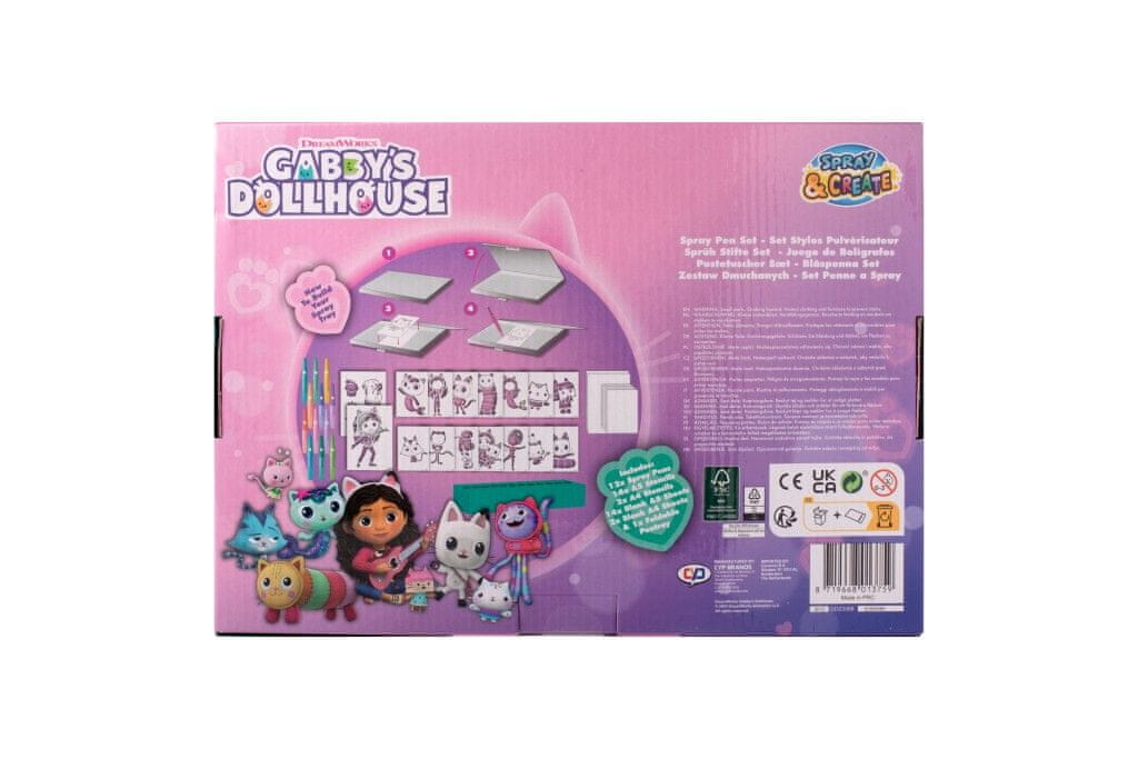 Gabinin komplet za slikanje z razpršilom Magic House – vsebuje praktično papirnato škatlo, 12 markerjev v razpršilu, 14 šablon A5 in 2 šabloni A4.