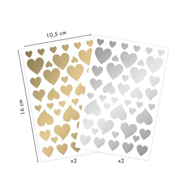 Maildor Inital nalepke z različnimi velikostmi srčkov v zlati in srebrni barvi. Paket vsebuje 4 liste, 2 motiva po 2 kosa. Nalepke je mogoče odlepiti in ponovno nalepiti. Dimenzije paketa: 10,5 × 16 cm.