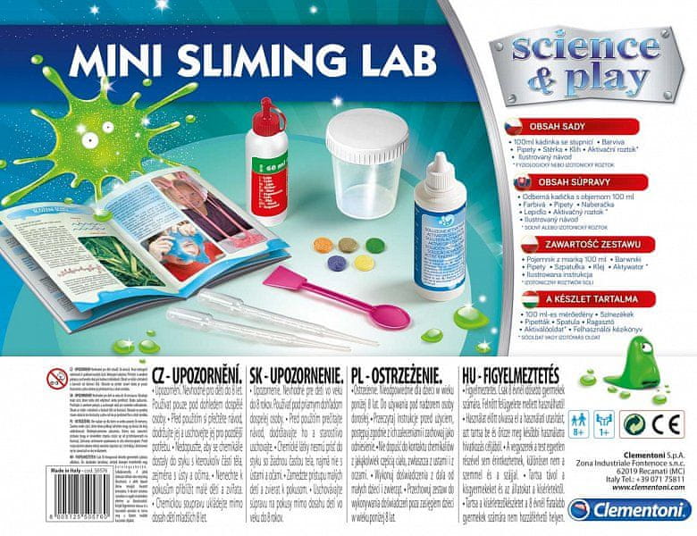 Clementoni Science & Play Otroški mini komplet laboratorija za sluz. Igrajte se in izvajajte poskuse kot mali znanstveniki. Komplet bo otroke na zanimiv način seznanil s skrivnostmi kemije in viskoznih tekočin. S pisanimi tabletami in bleščečim prahom, ki so vključeni v set, lahko otroci ustvarijo popolnoma edinstvene sluzi. Vsebina kompleta: lepilo, aktivacijska raztopina, barvne tablete, sljude v prahu, merilna skodelica, pipete, lopatka, posoda za shranjevanje, navodila. Zahvaljujoč ilustriranemu priročniku bo vaš otrok voden korak za korakom, tako da se bo lahko igral popolnoma varno. Komplet pomaga razvijati ročne spretnosti in ustvarjalnost. Jezikovne različice: CZ, SK, HU. Velikost paketa: 24,5 × 30,4 × 5,9 cm. Teža: 0,5 kg. Starost 8+