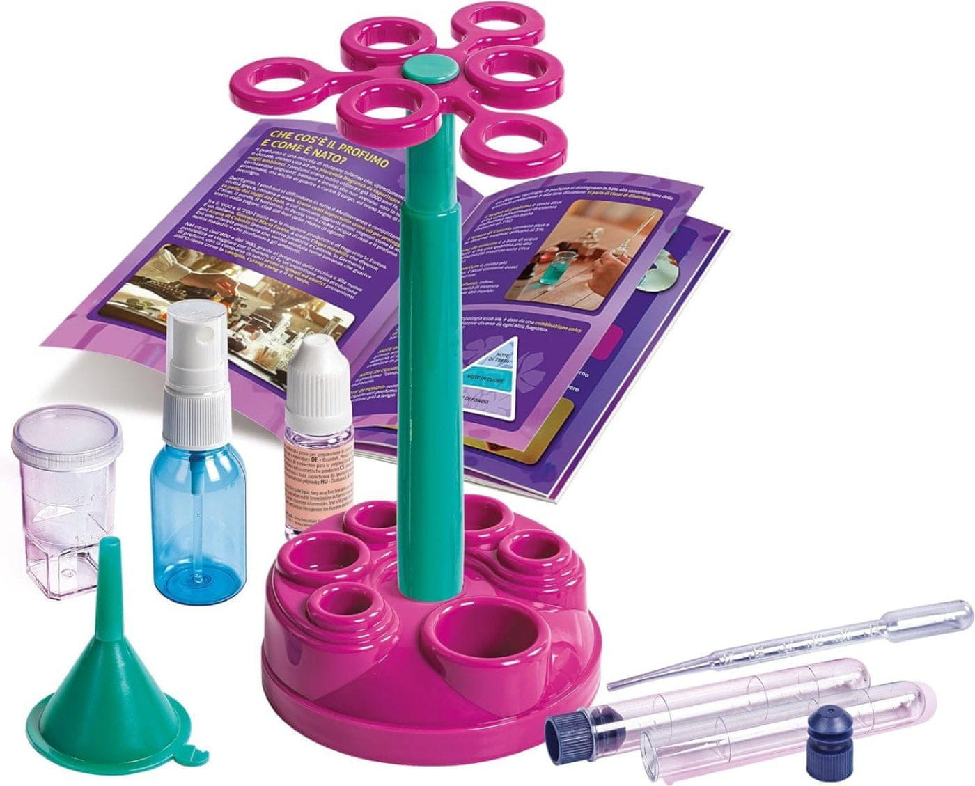 Majhen znanstveni laboratorij iz serije SciencePlay za eksperimentiranje in ustvarjanje parfumov.Praktično stojalo za postavitev epruvet med poskusiPosnetek vonja breskve, primeren za otroke in odrasleSpodbuja zanimanje za znanost in naravoslovne disciplineSlikovni priročnikSestavni del: stojalo, osnova za parfum breskve za kozmetične izdelke, merilna posoda 30 ml, steklenička, prozorne epruvete s pokrovčkom, pipeta, lijak, navodila z opisi in slikami (CZ, SK, HU, PL)Opomba: Stojalo je treba zložiti. Komplet ne vključuje vseh pripomočkov in materialov, potrebnih za izvedbo vseh navedenih poskusov (npr. demineralizirane vode)