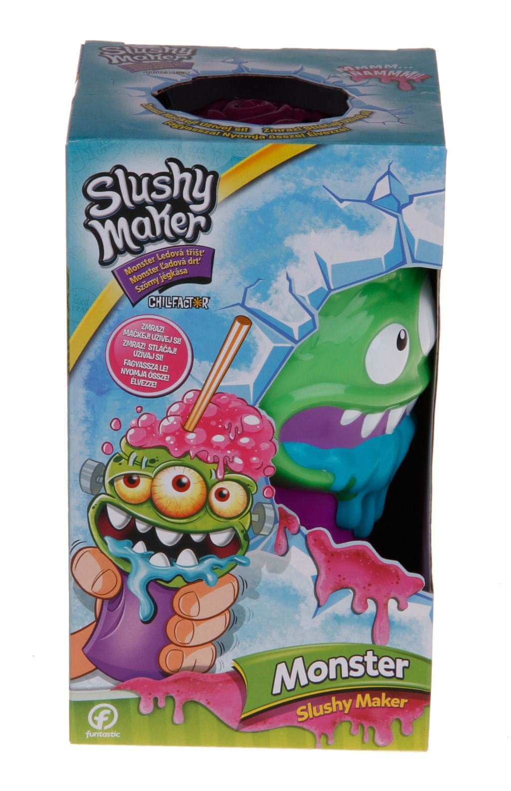 Zmrzni, stisni, uživaj! Naprava Monster slushy maker – naprava za pripravo ledene kaše v obliki enooke in trioke pošasti Chillfactor v manj kot minuti pripravi ledeno kašo. Tako preprosto je! Aparat za pripravo ledene kaše lahko uporabljate znova in znova. Preprosto ga operite, zamrznite in si privoščite zabavo z ledeno mlakužo!