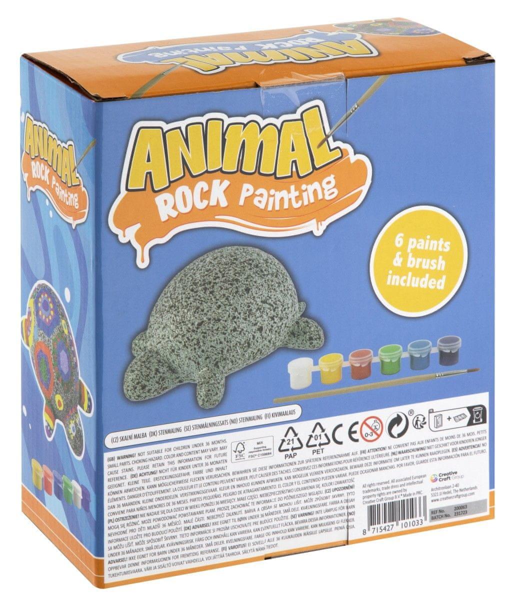 Slikanje kamna v obliki želve. Paket vsebuje kamen, 6 barv in čopič. Pakirano v škatli. Dimenzije paketa 16,8×18×7,5 cm. Starost 3+ (priporočljivo za starost 5+)