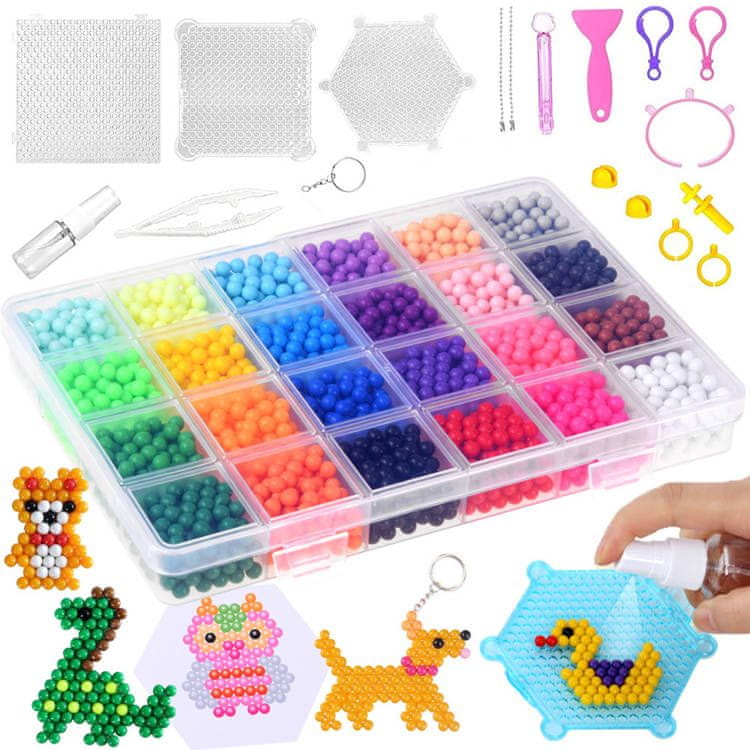 Čarobni set vodnih kroglic 24 barv je ustvarjalni set, s katerim lahko sami ustvarite čudovito sliko. V kompletu so že pripravljeni vzorci, ki olajšajo začetek igranja. Razporejene perlice lahko poškropite z vodo in ustvarite obesek za ključe ali 3D figurico. Naredi sam igračo. Odlična zabava ne le za najmlajše. Ponudba za domiselne in radovedne otroke. Komplet nam daje neomejene možnosti, da ustvarimo svoj svet, poln živih barv in nenavadnih idej. Uporabite svojo domišljijo in učinek vas bo presenetil.