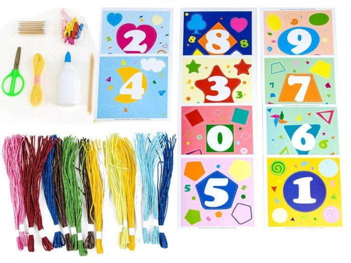 Kreativni set za malega umetnika v obliki barvnih papirnatih vrvicós in slikós za lepljenje. Komplet sestavljajo pisane slike, ki jih lahko nalepite po lastni presoji. Slike s številkami so odlične tudi za utrjevanje in pomnjenje številk.