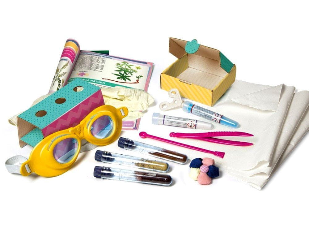 V škatli boste našli próbles iz bombažne tkanine, zaščitno opremo za mladega znanstvenika, potrebne pripomočke, kot so pinceta, testówka, naravni izvlečki dveh kemikalij in ilustrirana navodila.