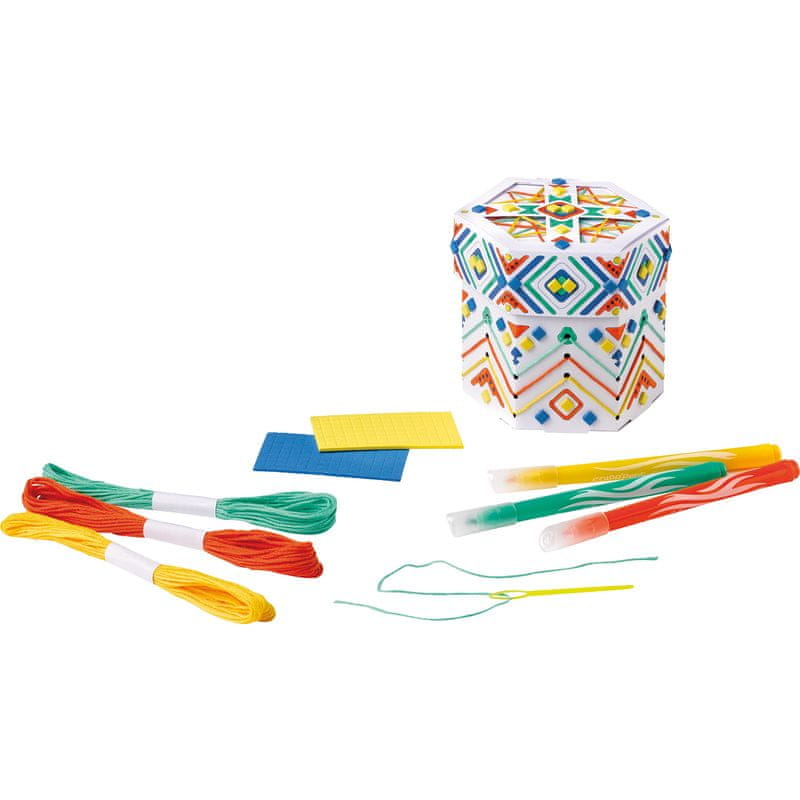 - Kreativni set vsebuje kartonsko maketo, 3 vrvice v različnih barvah, 1 plastično iglo, 3 flomastre in 2 lista mozaikov.