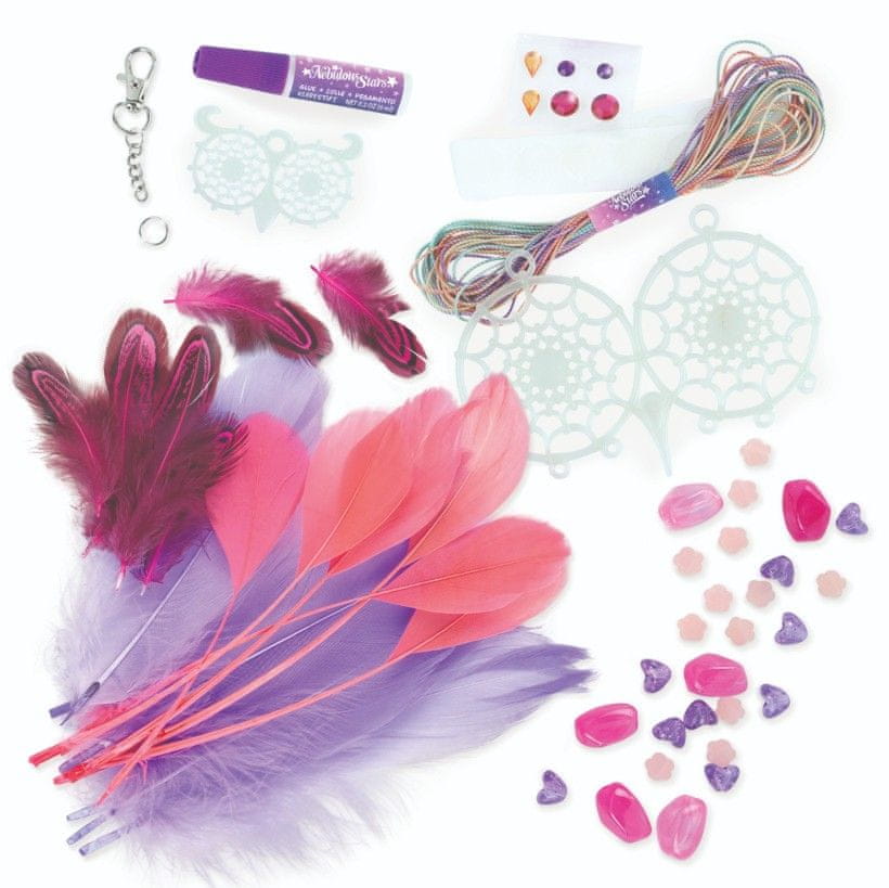 Lovilec sanj Nebulous Stars. Vsebina: 2 lovilca sanj, bombažna nit, 18 peres, 27 kroglic, 6 samolepilnih kamnov, lepilo za kamne, 12 lepilnih točk, obesek za ključe z verižico, prstan, Petuljina zgodba, … Celoten opis